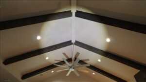 Figure 1. A vaulted ceiling that extended higher than the supply and return air exhibited surface staining and elevated moisture. This staining was only observed at the vaulted area, not at the remainder of the interior gypsum board finishes.